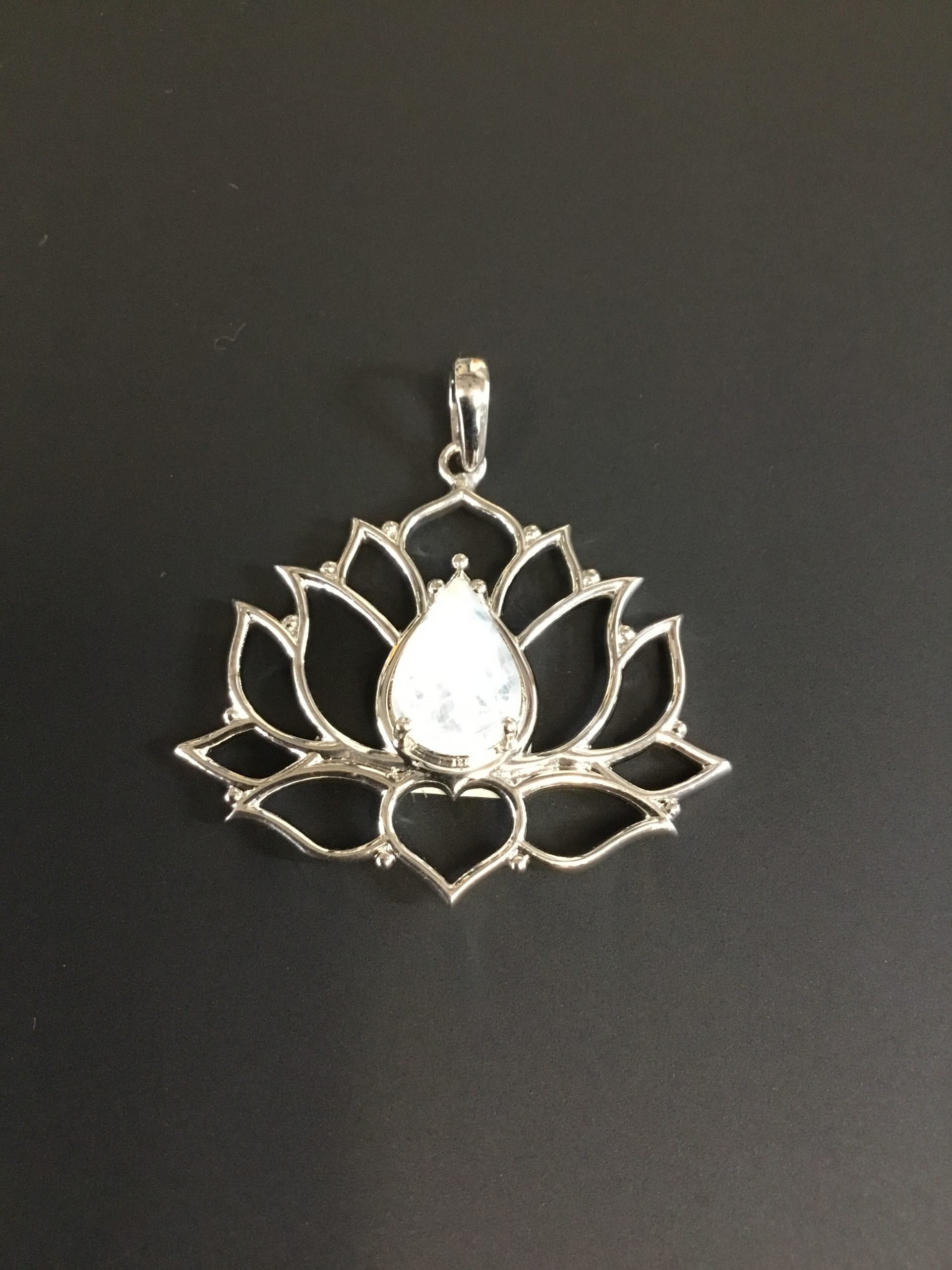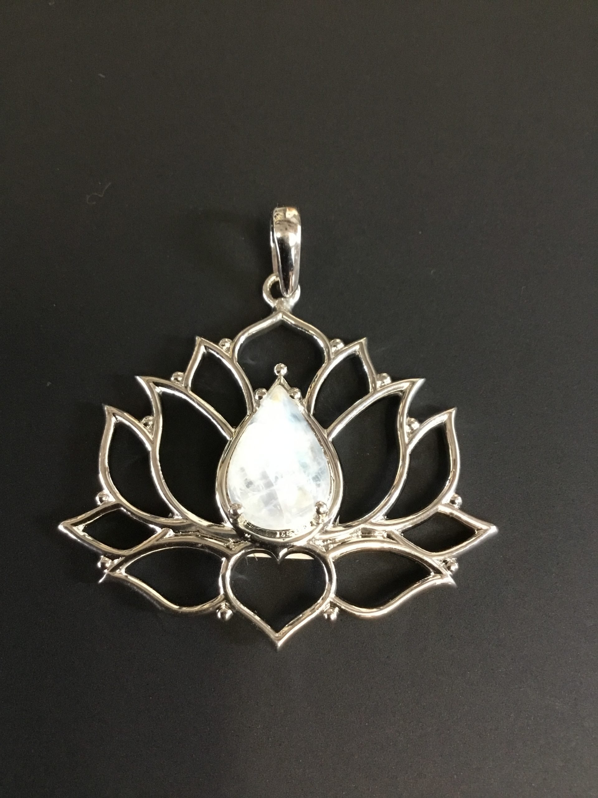 Sterling Silver with teardrop shaped Rainbow Moonstone in the center.